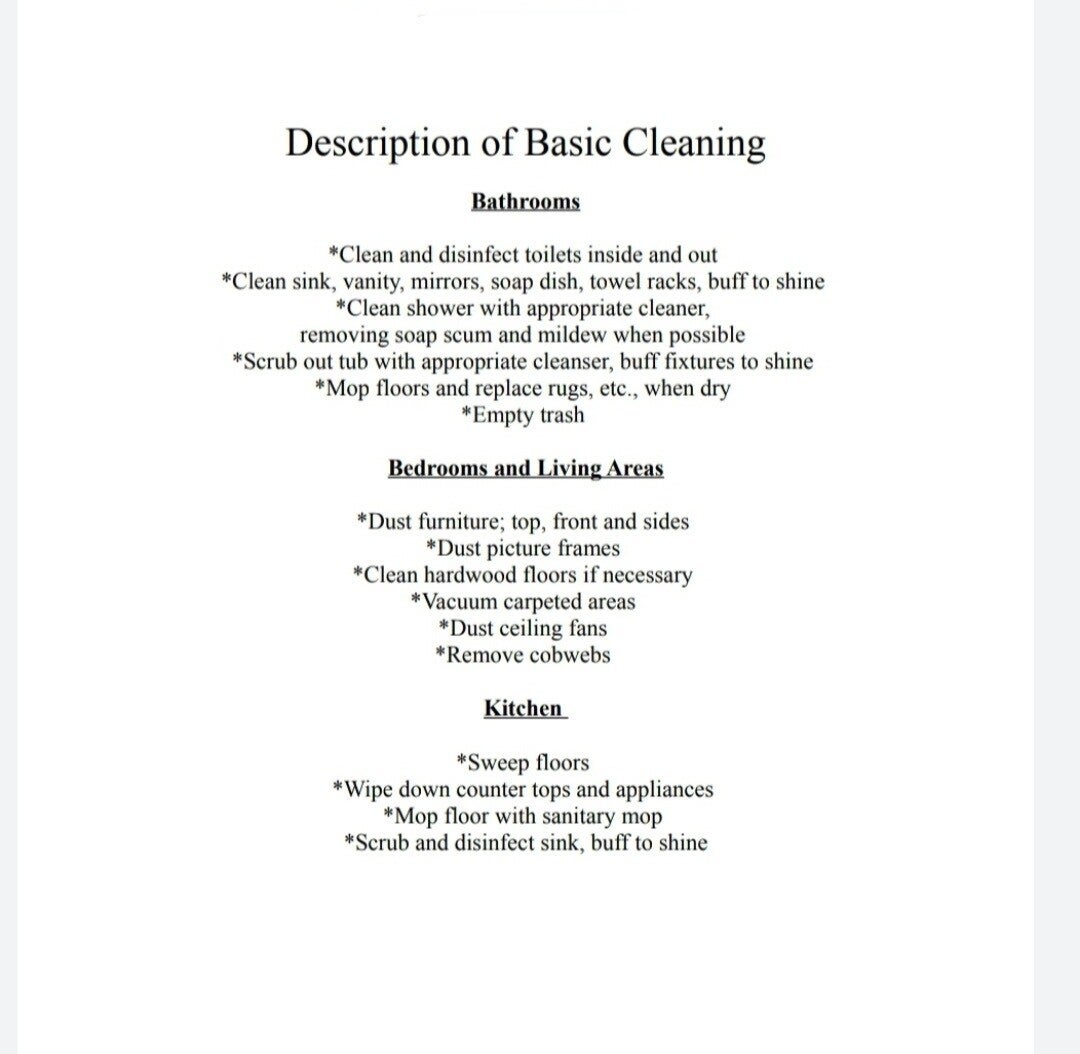 Hi! I have provided professional house cleaning services for families for over 35 years. I do all the work myself and I bring everything I need to do the job right. I have always enjoyed cleaning and the satisfaction of seeing my customers homes sparkle when I'm done. Below is a description of the cleaning I provide. If you are in need of assistance with your home, I would love the opportunity to serve you. Rates start at $100.